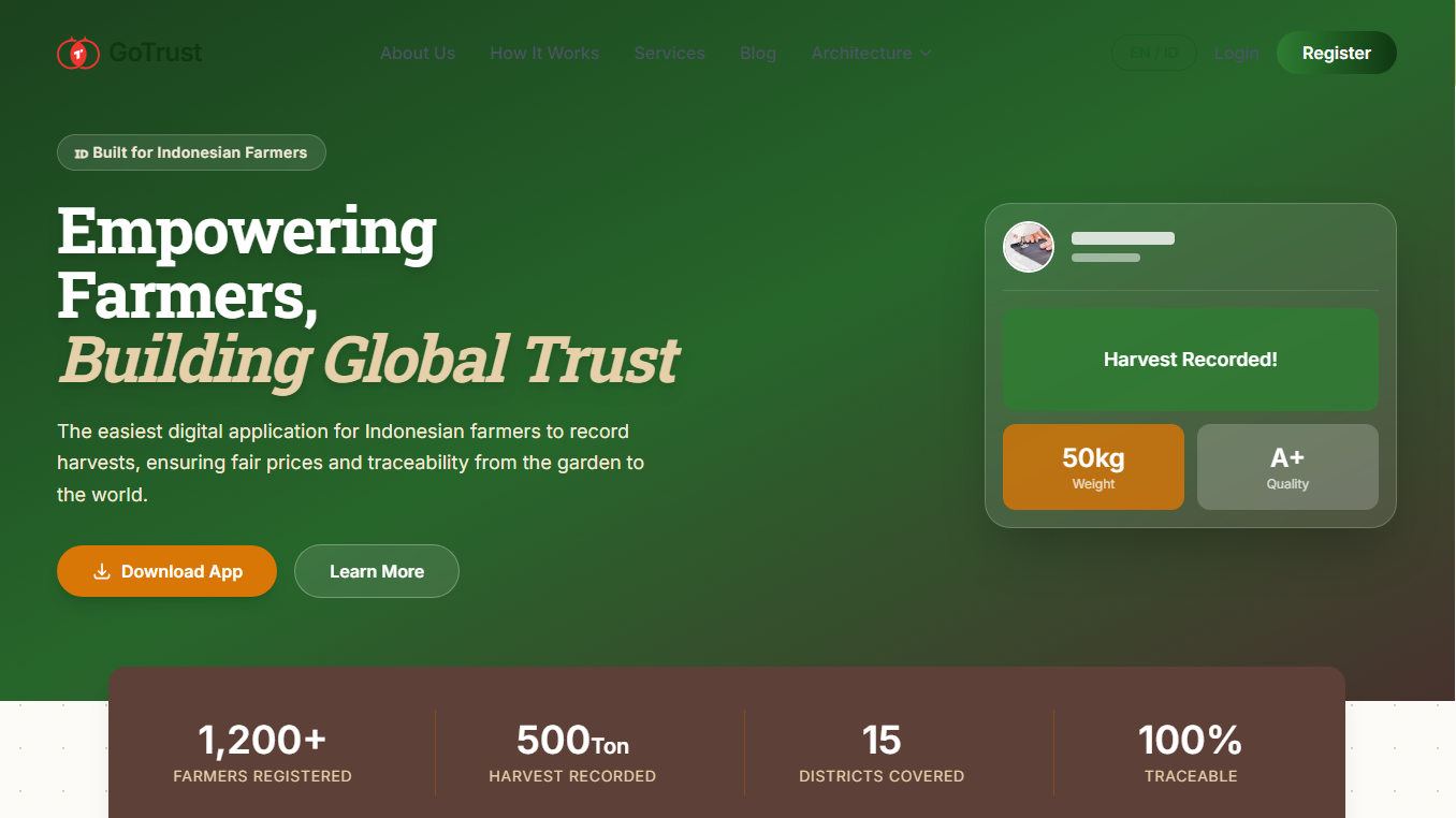 Empowering Farmers, Building Global Trust The easiest digital application for Indonesian farmers to record harvests, ensuring fair prices and traceability from the garden to the world.